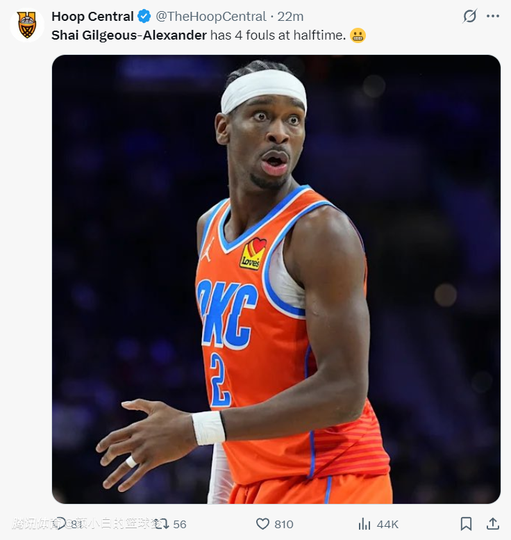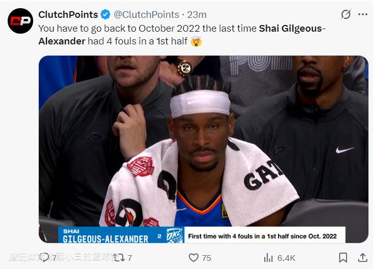 美媒写道:SGA上一次在上半场4次犯规还要追溯到2022年10月第二节还剩3分59秒SGA只能被换下。