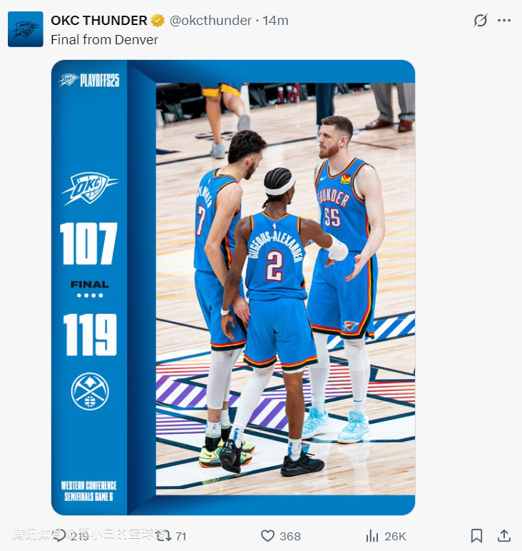 2025-05-16 11:50北京时间5月16日,雷霆以107-119不敌掘金,大比分3-3入抢七。这场比赛上半场两队都是博弈阶段,第三节末尾斯特劳瑟帮助掘金打出10-0后比赛走势改变了,末节掘金一度拉开到16分的差距,SGA无力回天,就卡鲁索一人在拼比赛走向完结。