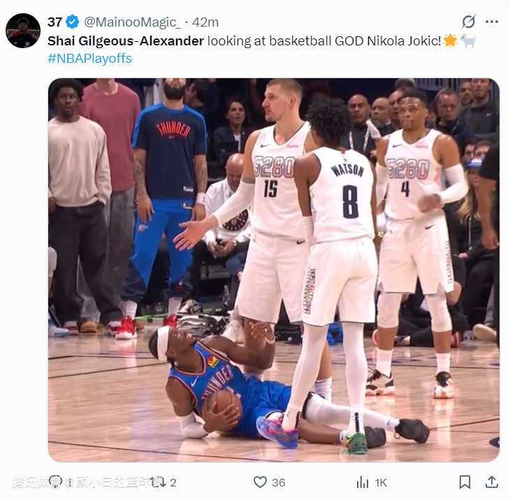 全场比赛SGA32分6助攻3篮板2失误,命中率68.8%,三分命中率50%,但美媒还是嘲讽他:亚历山大在地板上看着他的GOAT尼古拉-约基奇。