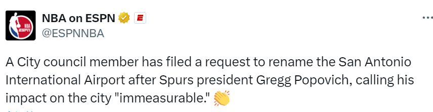 除此之外,ESPN报道,一名市议员还提交了一份申请,希望将圣安东尼奥国际机场以波波维奇来重新命名,并称波波维奇对这座城市的影响“不可估量”。波波维奇此前宣布不再执教马刺,而是专职于成为球队总裁。