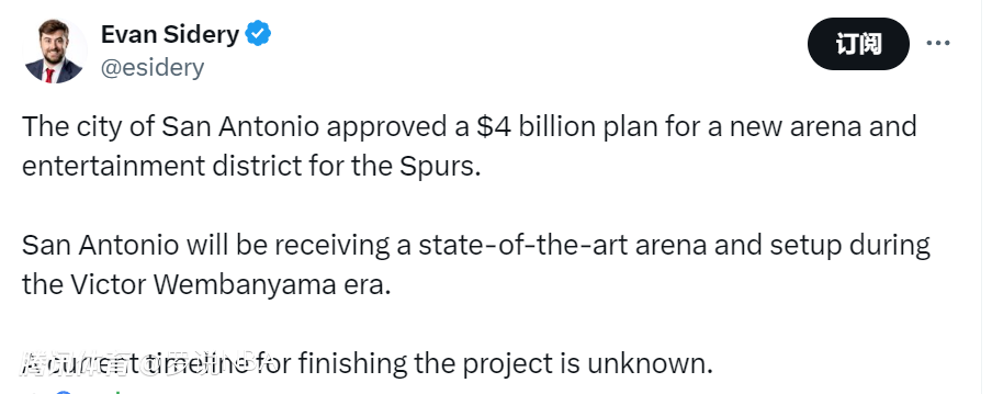 总耗资40亿美元!马刺获批建设新球馆 高管看好文班联手字母能冲冠