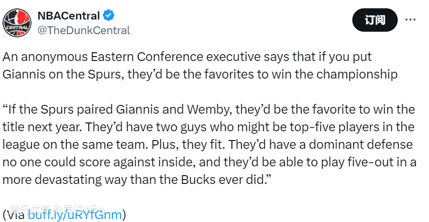 另外,马刺是字母哥的潜在下家。一位匿名的东部联盟高管表示:如果将扬尼斯(字母哥)能加盟马刺队,他们将成为总冠军的最有力竞争者。