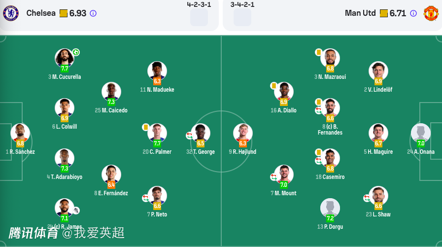 曼联首发:24-奥纳纳、2-林德洛夫、3-马兹拉维、5-马奎尔、13-多古、23-卢克-肖(81'26-海文)、8-B-费(81'37-梅努)、18-卡塞米罗(70'25-乌加特)、7-芒特(70'17-加纳乔)、16-阿玛德-迪亚洛、9-霍伊伦