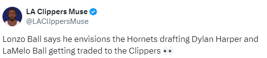 朗佐-鲍尔直言,他希望黄蜂选中迪伦-哈珀,随后将拉梅洛-鲍尔交易至快船。值得注意的是,去年采访中,兄弟俩的父亲拉瓦尔便曾表达过希望黄蜂将拉梅洛交易到快船的意愿。