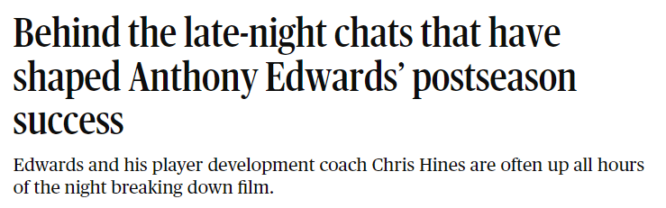 海因斯说道:“如果我给他发点东西,我会想‘希望他没醒,明天再看’,但他总会回‘我醒着’。那好吧,咱们现在就聊。赛后我们真的睡不了多少。大脑还在运转,竞争的劲头还没消。如果我们发现什么问题,就会立刻讨论,而不是等到明天。我们就这样互相碰撞想法。” 这些与海因斯的深夜录像分析环节,只是爱德华兹在这次季后赛中成长的一小部分——这次季后赛之旅与以往不同。前几个赛季,爱德华兹的季后赛表现以令人瞠目结舌的得分能力著称,而现在,他的打法更具耐心,在剖析对手如何防守他时更具思考性。他更像是一名组织者,愿意利用自己吸引的防守为队友创造空位机会,对阵勇士的第五场比赛中送出12次助攻就是证明——这是他季后赛单场助攻新高。他不再为了填满数据栏而强行出手,即便有时会有这种冲动。