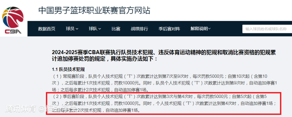 根据CBA官方规则显示:季后赛阶段,队员个人技术犯规次数累计达到第3次与第4次时,每次罚款5000元。自第5次起(含第5次),之后每累计1次技术犯规,罚款10000元。同时,个人技术犯规次数累计达到第4次时,自动追加停赛1场,之后每多累计2次技术犯规,自动追加停赛1场。