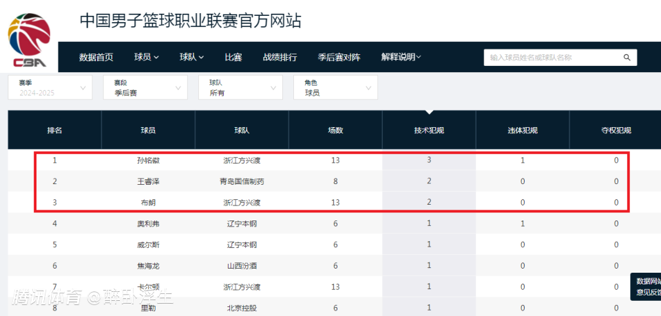 除此之外,其余球员技术犯规次数排名第二位是两个人,是广厦外援布朗2次与青岛球员王睿泽2次并列。