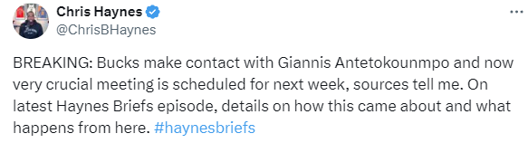 Haynes:字母哥下周与雄鹿管理层会谈 将表达个人需求并了解球队规划