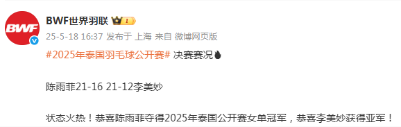 2025-05-18 17:10北京时间5月18日,在2025年泰国羽毛球公开赛女单决赛中,中国选手陈雨菲以21-16、21-12战胜东道主选手李美妙,夺得冠军。这是陈雨菲继2019年后再次在泰国公开赛夺冠。