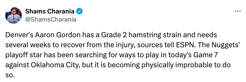 2025-05-19 05:10北京时间5月18日,据名记Shams报道,阿隆-戈登遭遇腿筋二级拉伤,需要数周时间进行康复,他一直在寻求方法参加掘金和雷霆的抢七大战,但身体情况似乎让这变得几乎不可能。不过,戈登展现了“硬汉”的一面,经过赛前热身,还是决定带伤出战抢七。