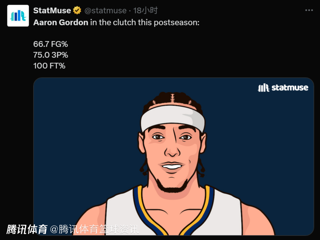 据统计,今年季后赛当戈登在场时,掘金每百回合净胜3.2分,而当他不在场时,球队每百回合净负26.5分。另外在今年季后赛关键时刻,戈登的三项命中率分别高达66.7%、75%和100%。首轮掘金和快船的系列赛,戈登压哨扣篮绝杀对手,这轮和雷霆系列赛的G1,戈登又完成一记三分球绝杀,G3他的那记关键三分球将比赛拖入加时,也为掘金最终获得胜利立下了汗马功劳。