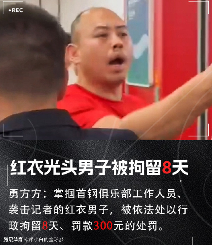 2025-05-19 06:10在北京时间5月18日晚,北京记者勇方方就报道,掌掴首钢俱乐部工作人员、袭击记者的红衣男子,被依法处以行政拘留8天、罚款300元的处罚。