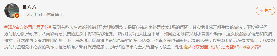 勇方方表示:“看到有些人在讨论孙铭徽开大脚被罚款(罚3万元),是否应该从重处罚停赛一场的问题。其实我非常理解联赛的做法,不希望任何一方的核心队员缺席,从而影响总决赛的胜负平衡和精彩程度。”