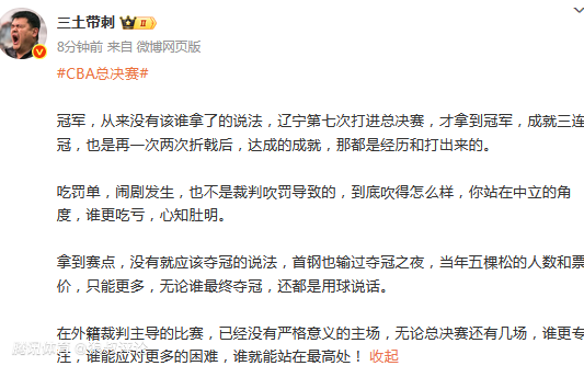 媒体人三土带刺发文点评:冠军,从来没有该谁拿了的说法,辽宁第七次打进总决赛,才拿到冠军,成就三连冠,也是在一次两次折戟后,达成的成就,那都是经历和打出来的。
