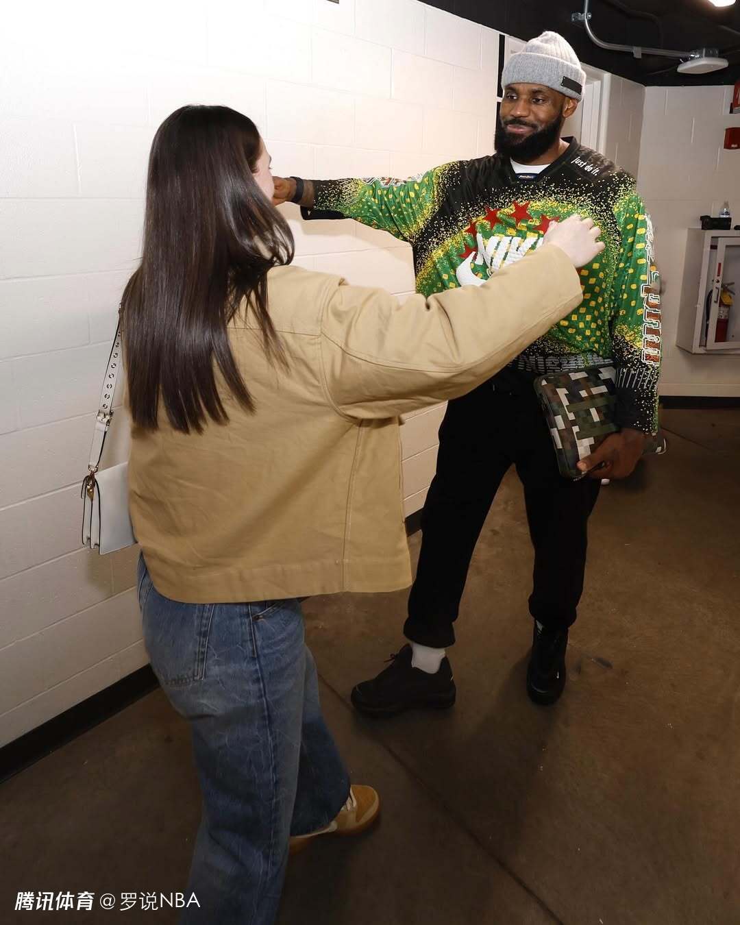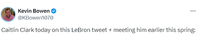究竟是什么让克拉克震惊不已?原来是她一直以来最崇拜的球员詹姆斯在Instagram上发布了一条饱含心意的动态。詹姆斯在动态中写道:“祝你本赛季一切顺利,和往常一样做你自己就好!!!@caitlinclark22”,还附上了三张两人近期在球员通道会面时微笑拥抱的照片。这条动态迅速在网络走红,最终也传到了克拉克那里。