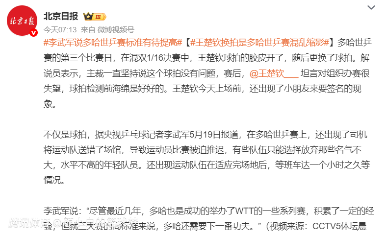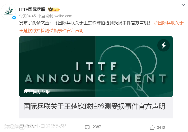 王楚钦球拍受损再登热搜:国际乒联已回应 记者直言主办方能力不足