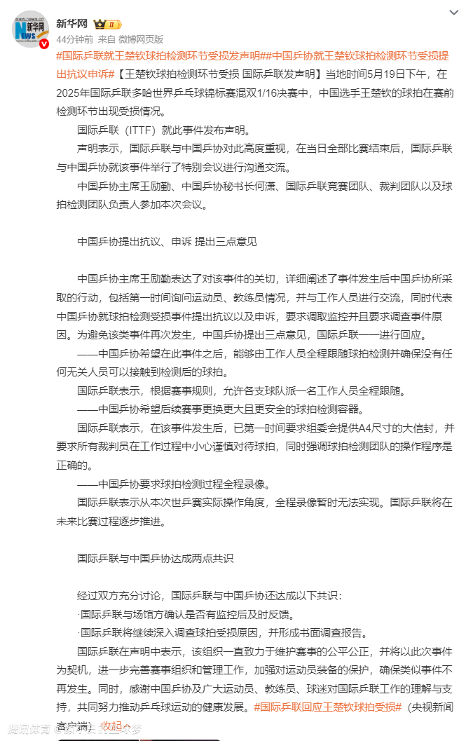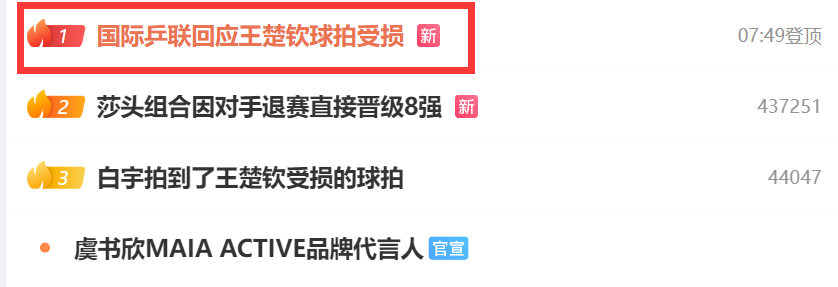 2025-05-20 09:10热搜前三:国际乒联回应王楚钦球拍受损、莎头组合因对手退赛直接晋级八强、白宇拍到了王楚钦受损的球拍。