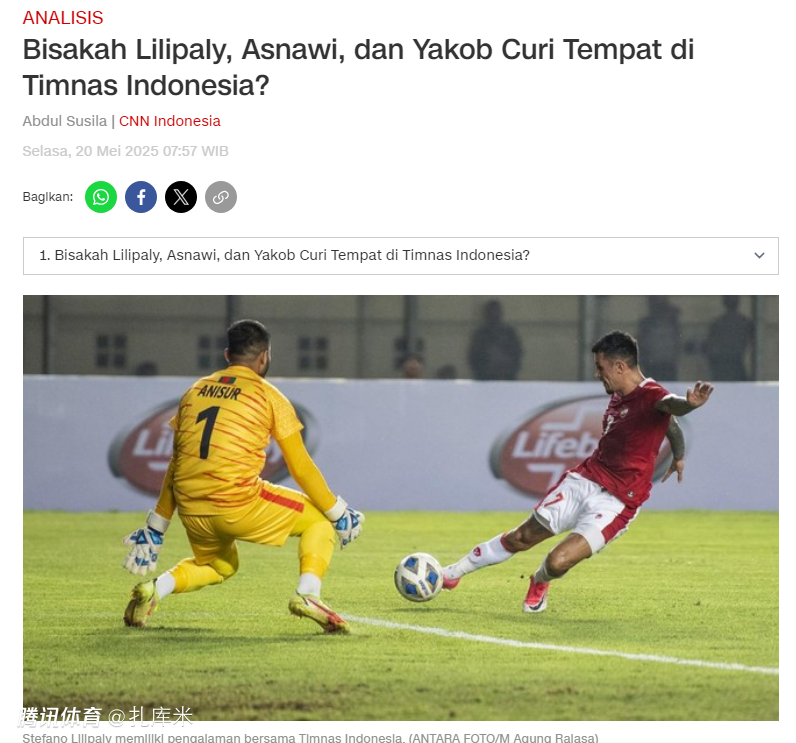 与国内媒体报道的印尼集训名单中有7名新人相比,印尼媒体的消息称,印尼此番集训名单只有5名新面孔。克鲁伊维特上任之后,经历了3月份的2场磨合之后,6月份的2场比赛,印尼的主力阵容很可能出现大调整,尤其和国足一役,包括门将派斯在内停赛,因此克鲁伊维特征召了5名门将,效力于意乙球队巴勒莫的穆利亚迪最有希望成为首发门将出战国足。