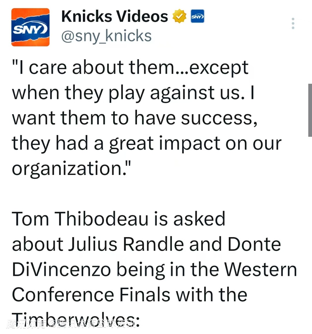 当被问及他是否关注前队员兰德尔和迪文琴佐随森林狼队打入西部决赛时,锡伯杜说道:“我关心这些球员,除非他们与我们为敌。我希望他们成功,他们曾对我们的球队产生过重要影响。”