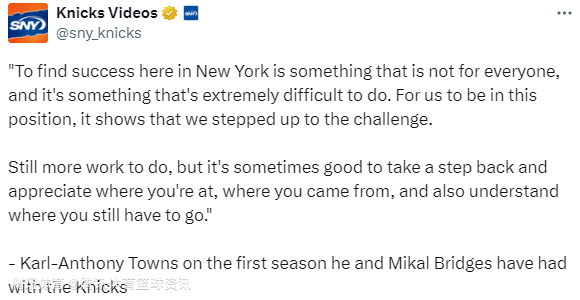 关于球队表现,唐斯说道:“对阵凯尔特人的最后一场比赛,我们终于展现出一支能在48分钟内保持专注的球队应有的样子。现在我们必须找到办法,让每场比赛都做到这一点。这是我们需要拿出最佳状态的时刻。” 谈到自己与米卡尔-布里奇斯在尼克斯的首个赛季,唐斯表示:“在纽约取得成功并非易事,也不是所有人都能做到。我们能走到现在,说明我们勇于迎接挑战。 ”