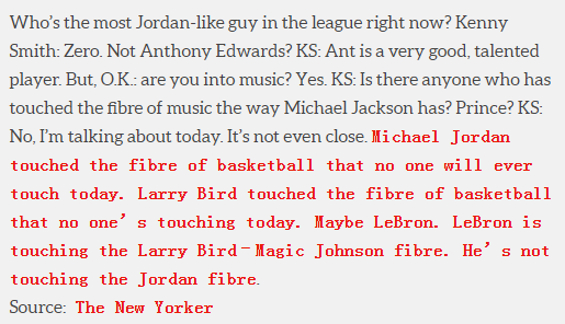 肯尼-史密斯继续说道:“我是说现在的人。根本没得比。迈克尔-乔丹触及了篮球的灵魂,这是如今任何人都无法企及的。拉里-伯德也曾触及篮球的灵魂,同样无人能超越。也许詹姆斯算一个——他正在接近拉里-伯德和 “魔术师” 约翰逊的高度,但他没有达到乔丹的层次。”