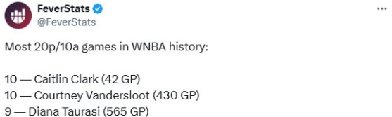 根据数据统计显示,这是凯特琳-克拉克职业生涯第10次单场得到至少20分10助攻的两双数据,追平范德斯鲁特,并列WNBA历史第一位。而值得一提的是,凯特琳-克拉克做到这点仅打了42场比赛,范德斯鲁特则打了430场比赛。