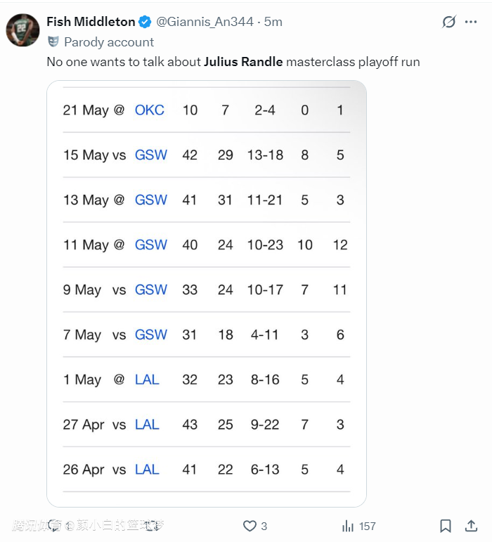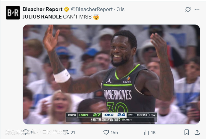 2025-05-21 10:10北京时间5月21日,西决G1上半场,朱利叶斯-兰德尔的外线太过于神准,BR写道:兰德尔不会投丢的!上半场打完兰豆20+5三分+真实命中率102.5%,森林狼48-44领先雷霆。