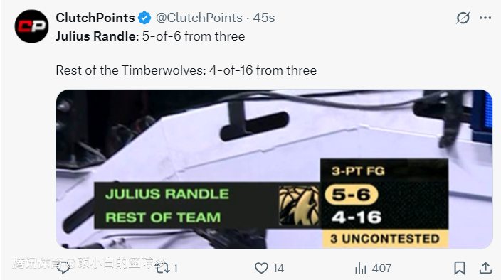 真实命中率102.5%!兰德尔半场20+5三分创纪录 美媒赞大师级表现