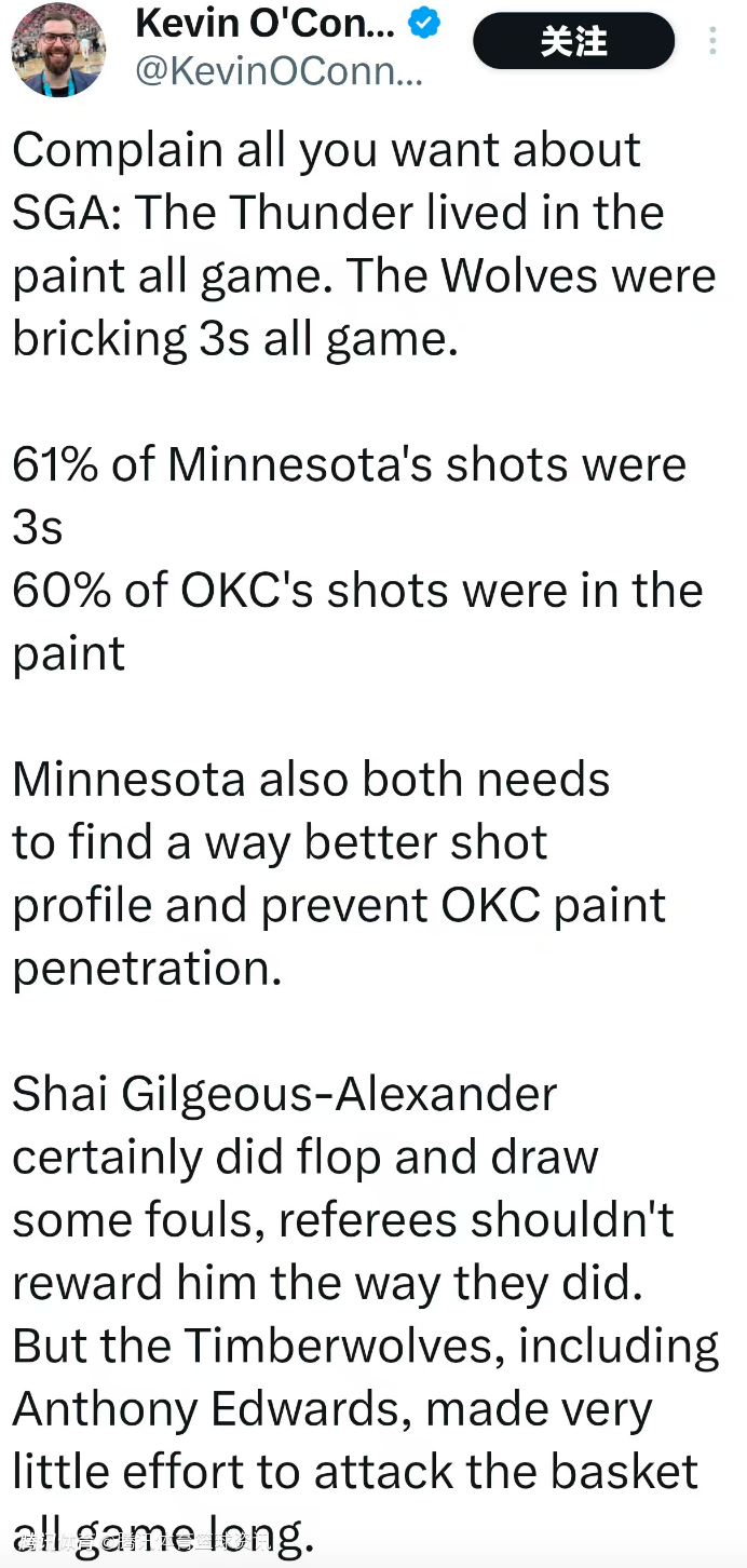 赛后,名记奥康纳对于本场比赛森林狼的表现进行点评,他发文如下: