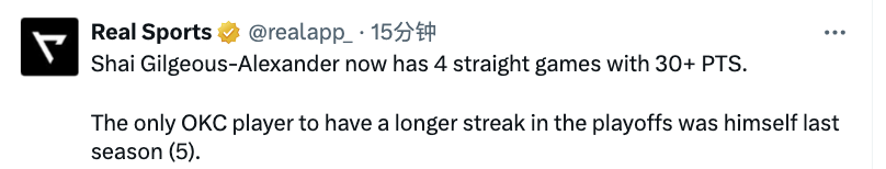 此役雷霆当家球星亚历山大首发出战37分钟,27中10拿到31分5篮板9助攻3抢断,+22的正负值为全队最高。他成为了雷霆队史继2016年的杜兰特之后,又一位在西决拿到30+的球员,另外他季后赛连续4场比赛30+,在雷霆队史中,唯一在季后赛中拥有更长连续30+得分场次的球员正是他自己,上赛季他曾达成5场连续30+的纪录。