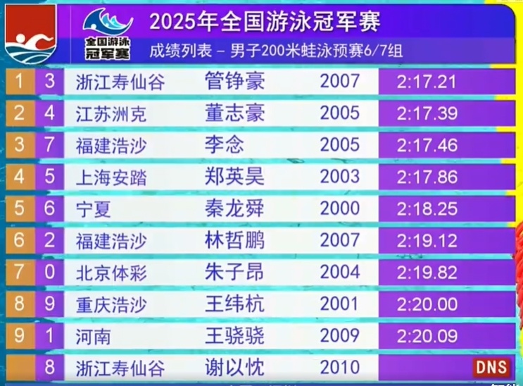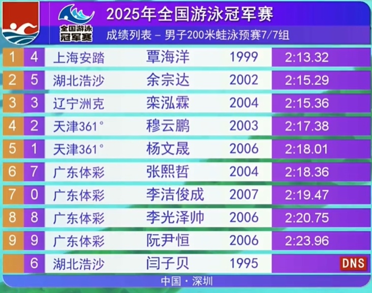 冠军赛男200蛙覃海洋预赛力压群雄!闫子贝退赛,谢以忱成绩被取消