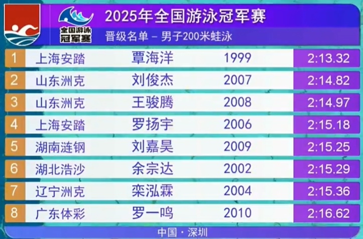 2025-05-21 15:10在2025全国游泳冠军赛男子200米蛙泳预赛中,覃海洋以2分13秒32轻取第一!山东双雄紧随其后:刘俊杰以2分14秒82排在第二;王骏腾以0.05秒之差排第三。