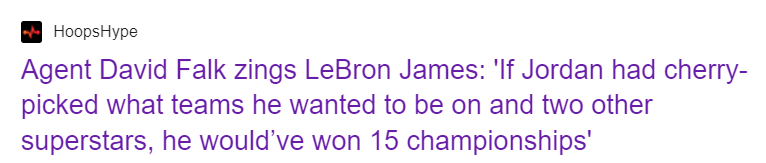 2025-05-21 20:20北京时间5月21日,前NBA知名经纪人大卫-法尔克参加了SBJ第四届体育商业会议, 在采访中聊到了自己昔日代理乔丹等客户的话题,也谈到了他对詹姆斯的看法。他指出,如果乔丹能自己选队并和两位超级球星搭档,他早已经夺得15个总冠军。