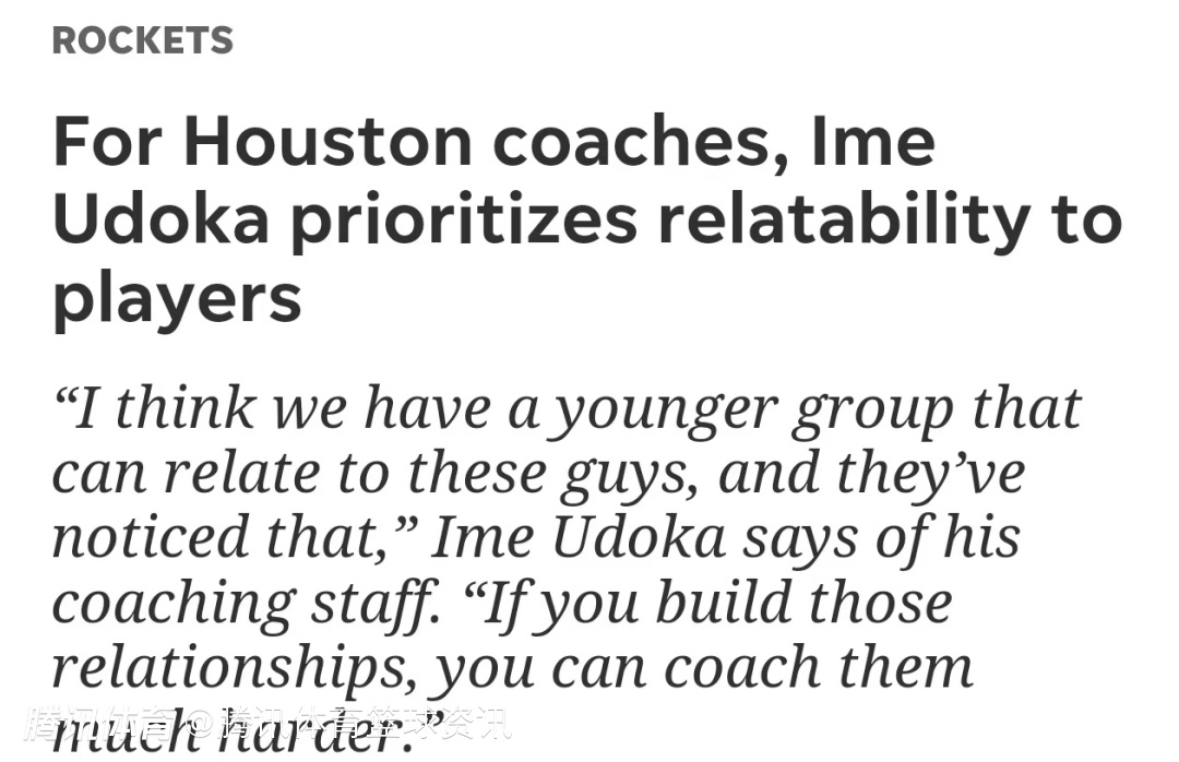 乌度卡现年47岁,火箭队的许多助理教练(本-沙利文、罗亚尔-艾维、加勒特-杰克逊、卡姆-霍奇斯、迈克-莫泽和威尔-邓恩)与他年龄相仿,甚至更年轻。