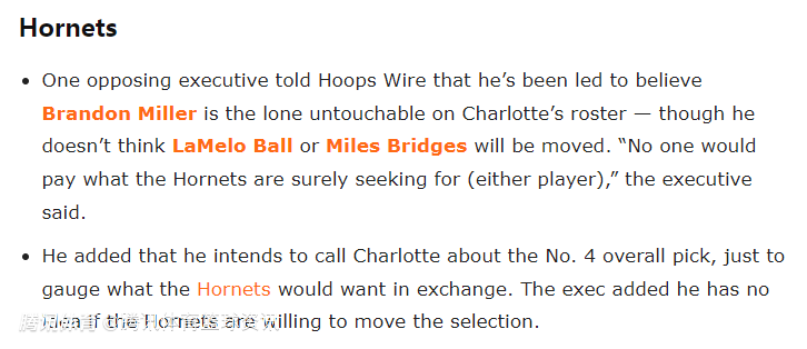 据悉,一位联盟高管向Hoops Wire透露,他认为黄蜂队阵容中唯一绝对不可交易的球员是布兰登-米勒——尽管他认为拉梅洛-鲍尔和迈尔斯-布里奇斯也不会被送走。该高管也表示,没有球队会愿意为这两名球员开出黄蜂想要的报价。