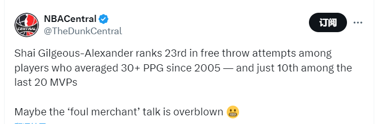 该媒体写道:“数据显示,自2005年以来,在所有场均得分30+的球员中,亚历山大的罚球次数仅排名第23位;而在过去20位MVP得主中,其罚球次数也仅列第10位。或许关于‘罚球商人’的讨论确实被过度放大了。”