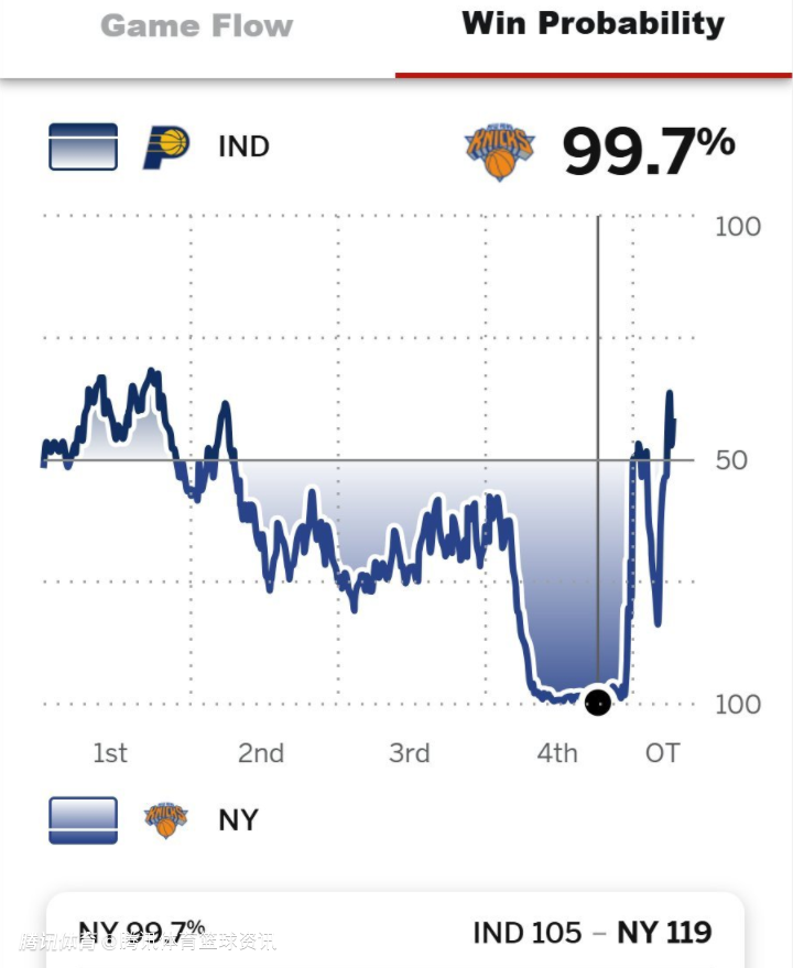 第四节比赛结束前2分51秒,布伦森三分远投命中,步行者队105-119落后14分,当时步行者队的预期胜率仅为0.3%。