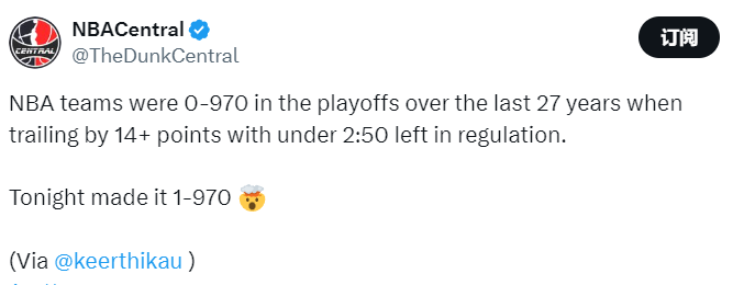 根据数据统计显示,在过去27年的时间里,当一支球队在比赛结束前2分50秒落后至少14分的情况曾出现过970次,没有任何一支球队完成过翻盘。直到今晚的步行者队取胜,才终结了这个纪录。