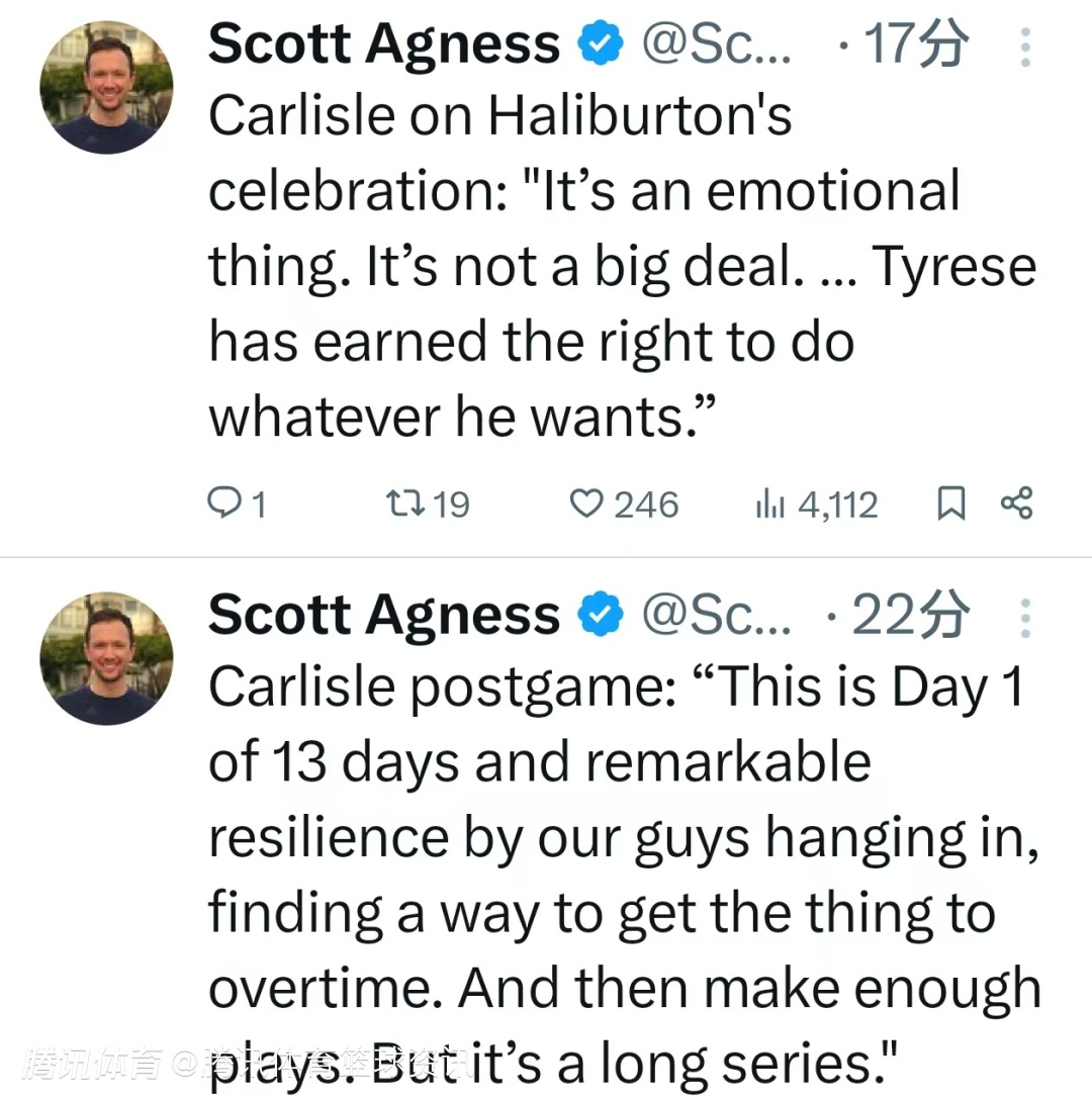 谈及哈利伯顿的庆祝动作,卡莱尔表示“这是情绪的自然流露,没什么大不了的……哈利伯顿有资格做任何他想做的事。”