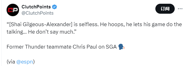 保罗表示:“亚历山大很无私,他专注打球,用比赛表现说话,他的话并不多。”