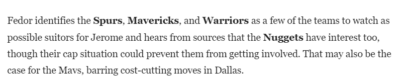 费多尔提到,勇士、马刺和独行侠都是杰罗姆的潜在追求者