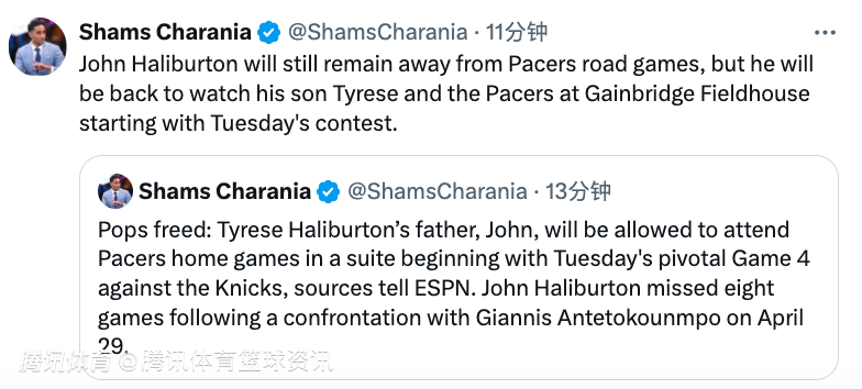 Shams:哈利伯顿父亲获准从东决G4在包厢内观看步行者主场比赛