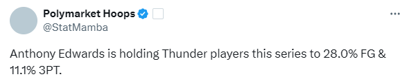 据美媒StatMamba发布的数据统计显示,在此前结束的西决前三场比赛中,在森林狼球星爱德华兹的防守之下,雷霆队的球员投篮命中率只有28%,三分命中率仅有11.1%。