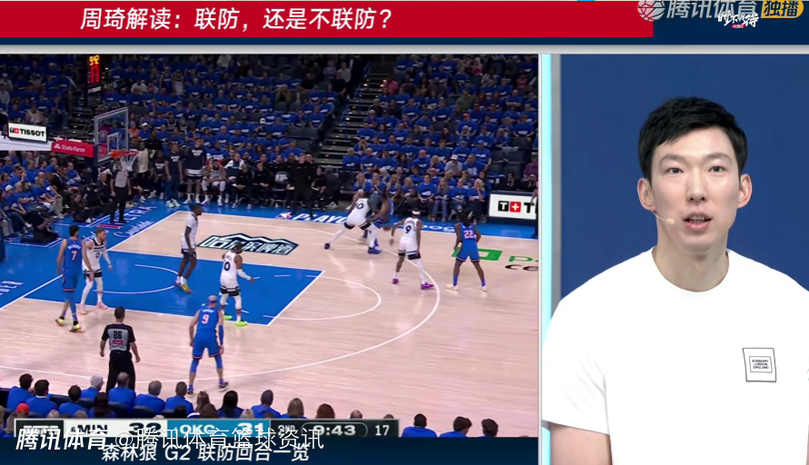 在谈到森林狼队使用的联防策略时,周琦表示:如果有好内线,守联防会比较省力。内线可以大部分时间守住禁区,保护篮板。但NBA有防守三秒,对内线球员的移动能力要求高,需要不停的要去触碰进攻人,或者是出3秒区,所以这个跟FIBA还不太一样。联防可以主动,当然也可以被动,我刚看到一个镜头,就是戈贝尔在防切特的时候,其实当一般这种情况下,你在面对一个比你身高稍微矮一些,但是有投射能力的内线的时候,你守联防其实会对你的这种轮转会好一些,因为这样的话,不需要这边大量时间再往外扑。对他节省体能,然后保护篮板,保护篮下,其实是一个非常好的办法。”