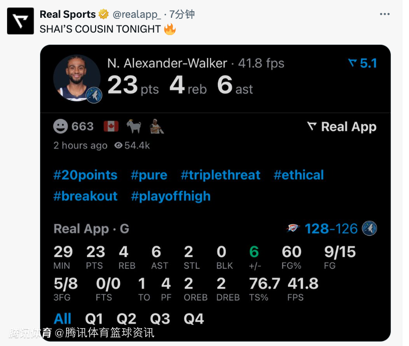 2025-05-27 11:40北京时间5月27日,NBA西决G4,森林狼客场以126-128不敌雷霆,总比分1-3落后,此役亚历山大-沃克面对刚刚拿到MVP的表哥亚历山大,有着出色表现,拿到全队最高的23分。