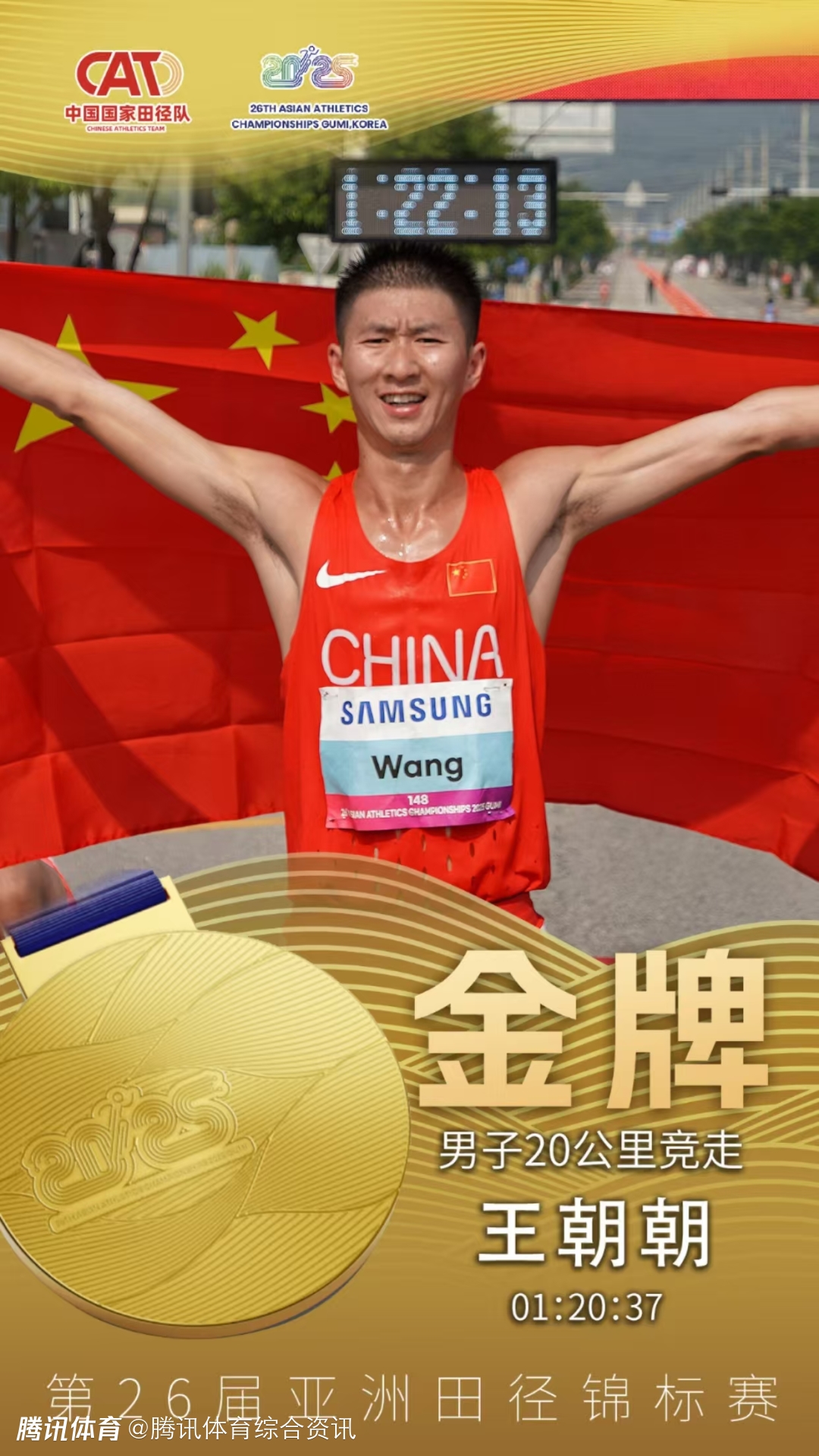 2025-05-27 12:10北京时间5月27日,第26届亚洲田径锦标赛在韩国龟尾市开赛,本届赛事首金在男子20公里竞走赛场诞生,中国选手王朝朝以1小时20分37秒的成绩夺金,另一位中国选手张金睿收获第六。