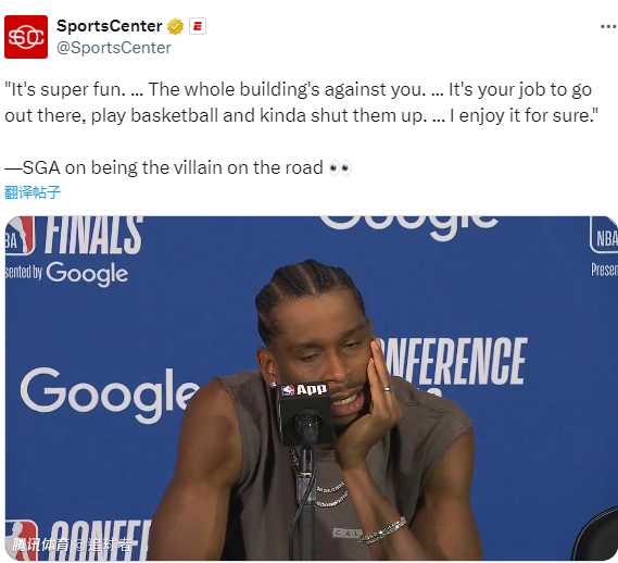 雷霆西决G4赢球赛后,谈到被森林狼主场球迷称为Free throw merchant(罚球商人或者碰瓷大师)以及被称为恶棍,亚历山大表示:我不在意,我从来就没在意过,我把这当作一种褒奖;这真的超级有趣,整栋楼的人都和你作对,你的任务就是出去打篮球,让他们闭嘴,我当然很享受。