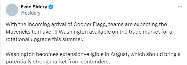 据悉,PJ-华盛顿将在8月具备续约资格,这可能会吸引众多争冠球队形成潜在的强劲市场需求。此前有消息称,独行侠方面正在争取为球队引入一名首发级别的控球后卫顶替伤缺的欧文,而一旦欧文恢复健康,这名球员可以转换为辅助角色。
