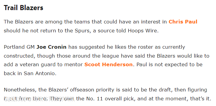 尽管如此,开拓者休赛期的首要任务仍是选秀,他们手握11号签,而现阶段球队的建队重心也在于此。