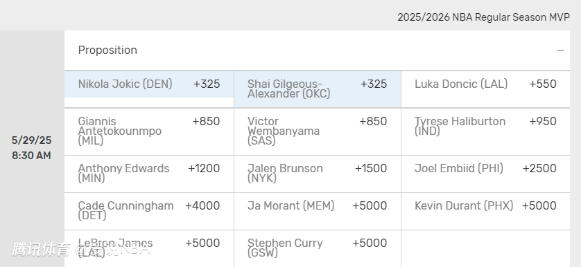 下赛季MVP赔率:约基奇亚历山大领跑东契奇第3 詹杜库并列第11